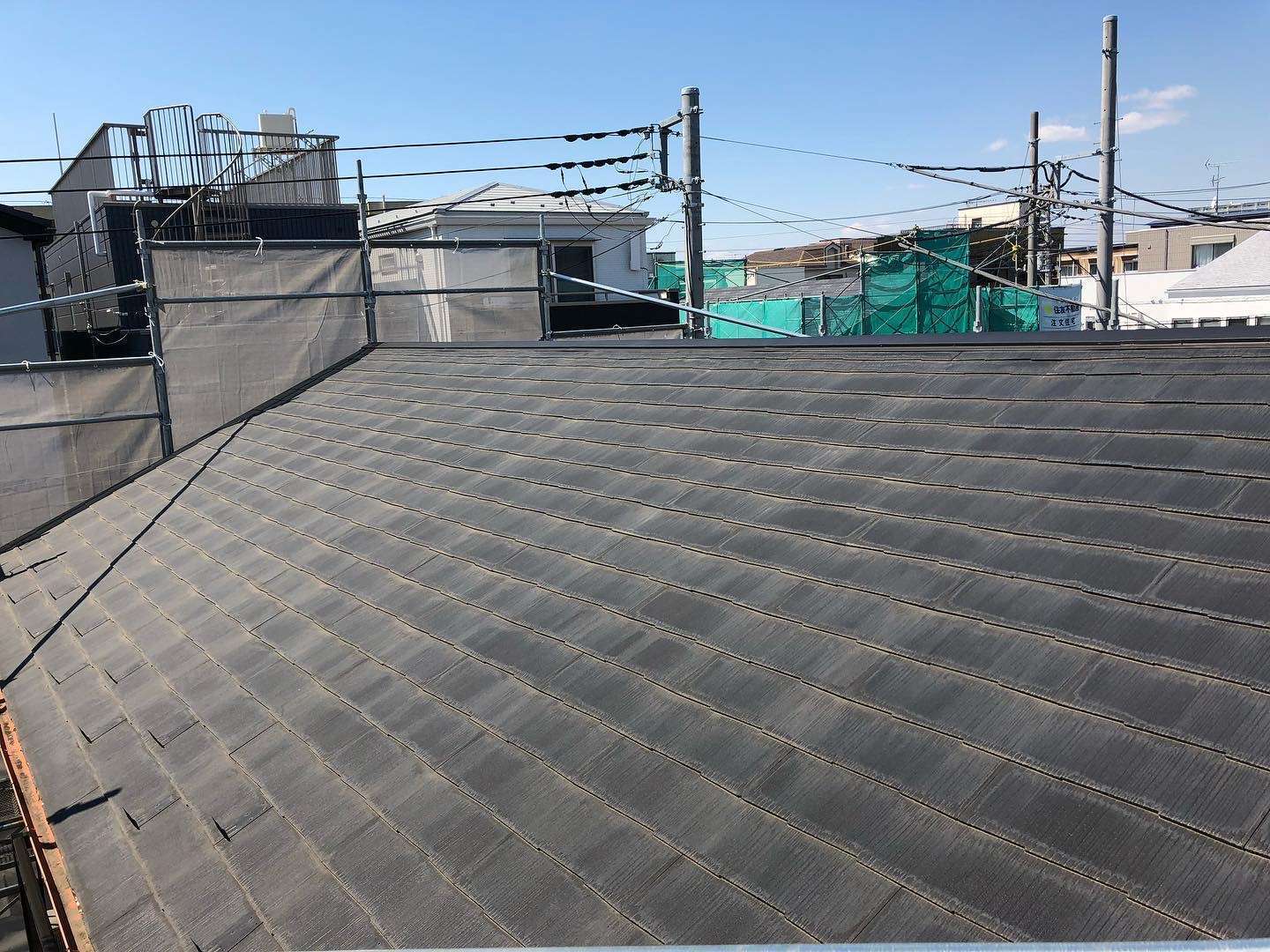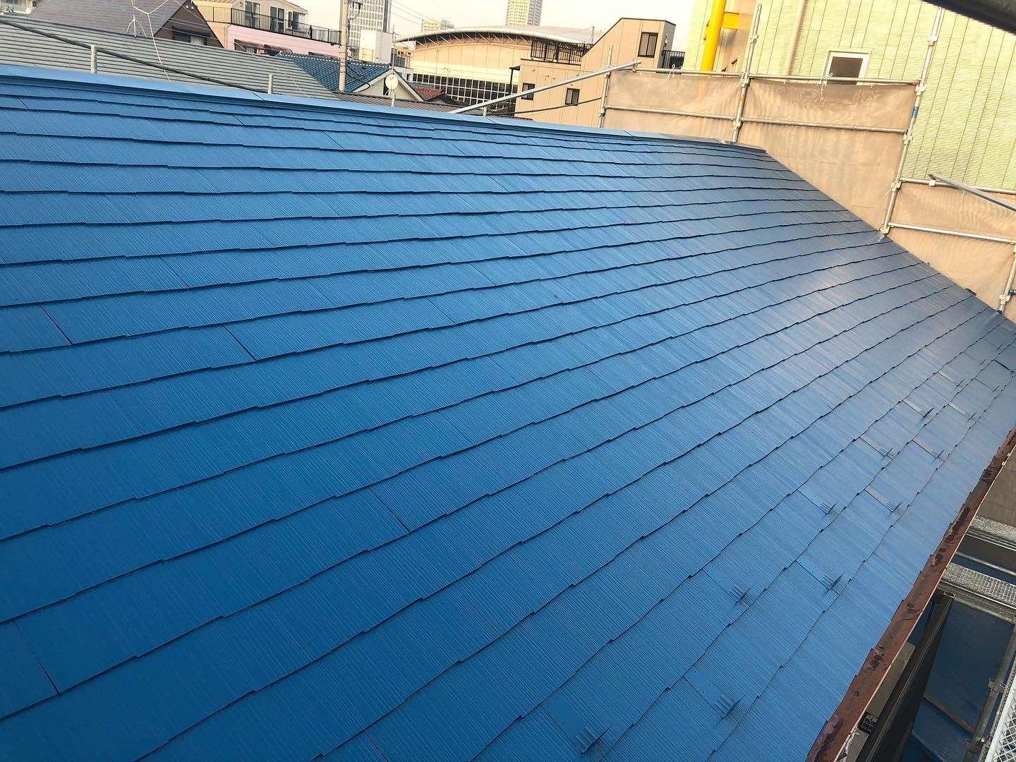 波板屋根の塗装ビフォーアフターです! 高圧洗浄後にケレン(古い塗膜、錆などの除去)を徹底的に行い、2液性の錆止め塗料を2回塗りました。既存…